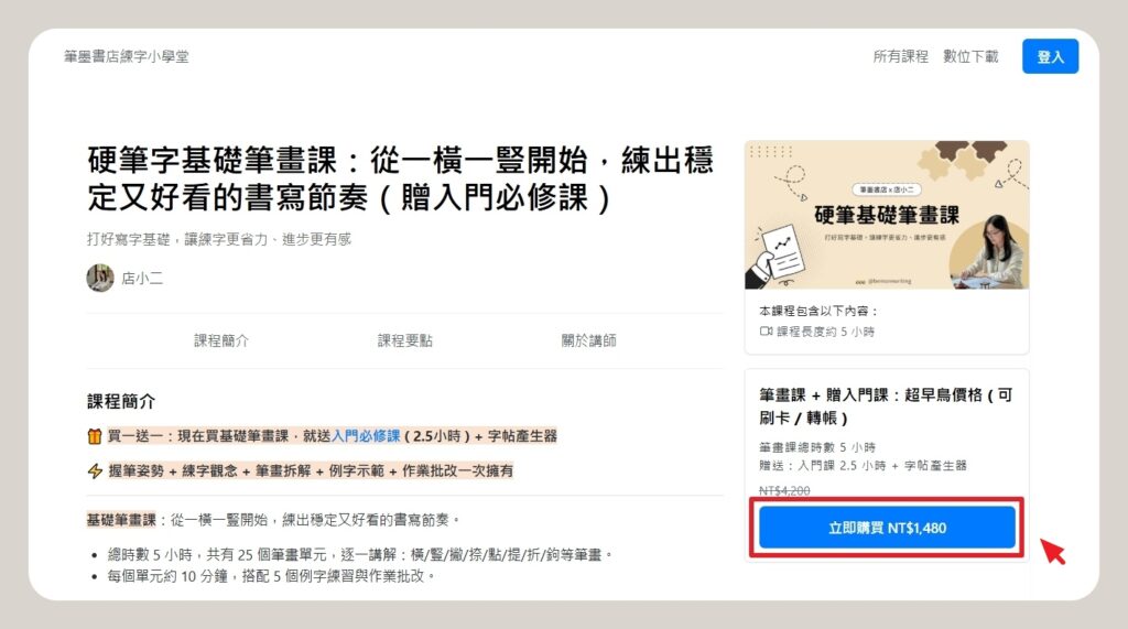 嗨嗨~我是店小二,這篇文章將說明如何購買「硬筆字基礎筆畫課」,如果操作過程有遇到任何問題,可以隨時私訊我的官方 LINE 帳號 @512eaawm 唷~