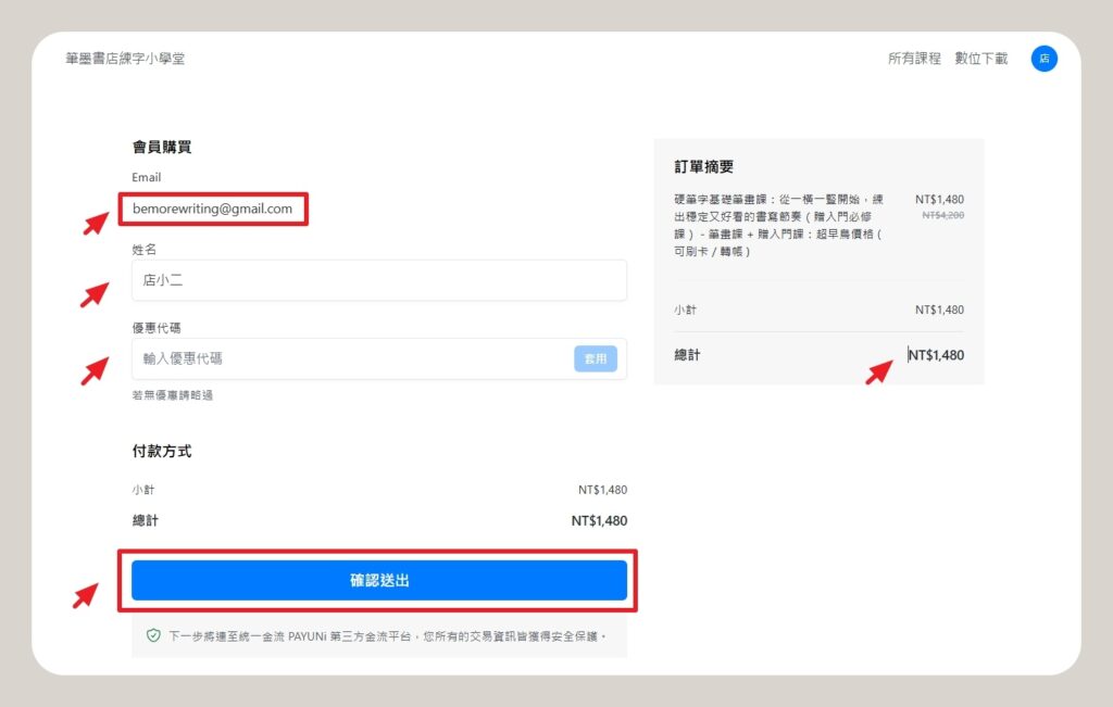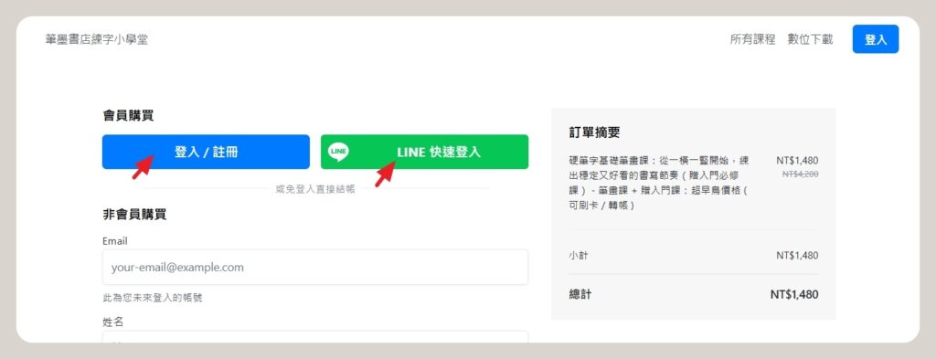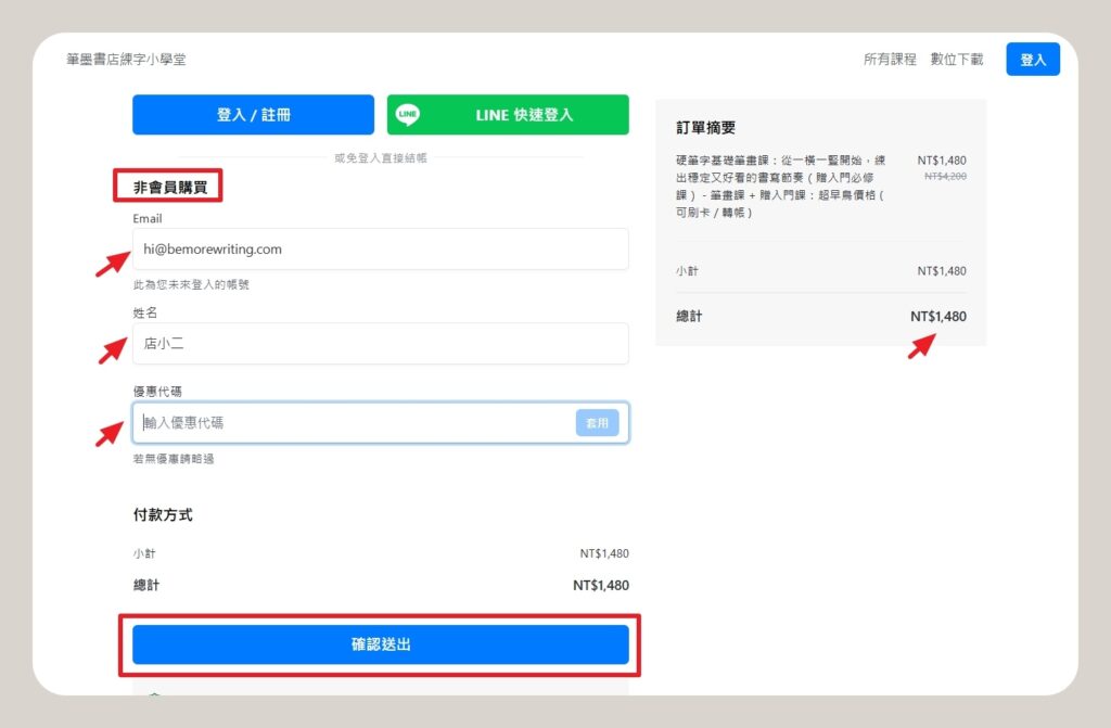如果你想自行創建自己的帳號與密碼,可以在「非會員購買」輸入你未來要登入課程平台的「 Email 」與「姓名」。「密碼」的部分會在成功後買後進行設定。