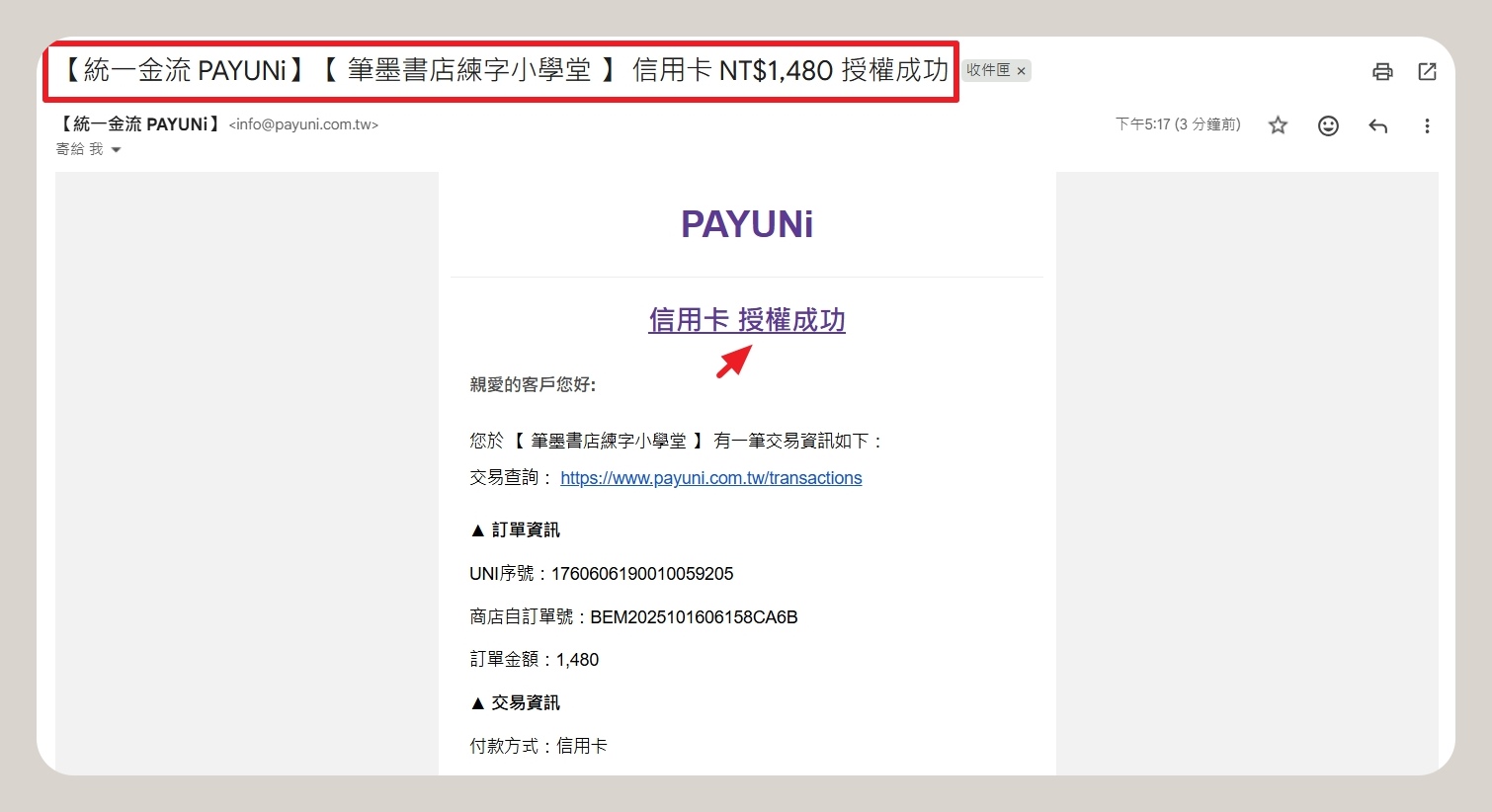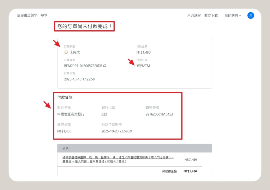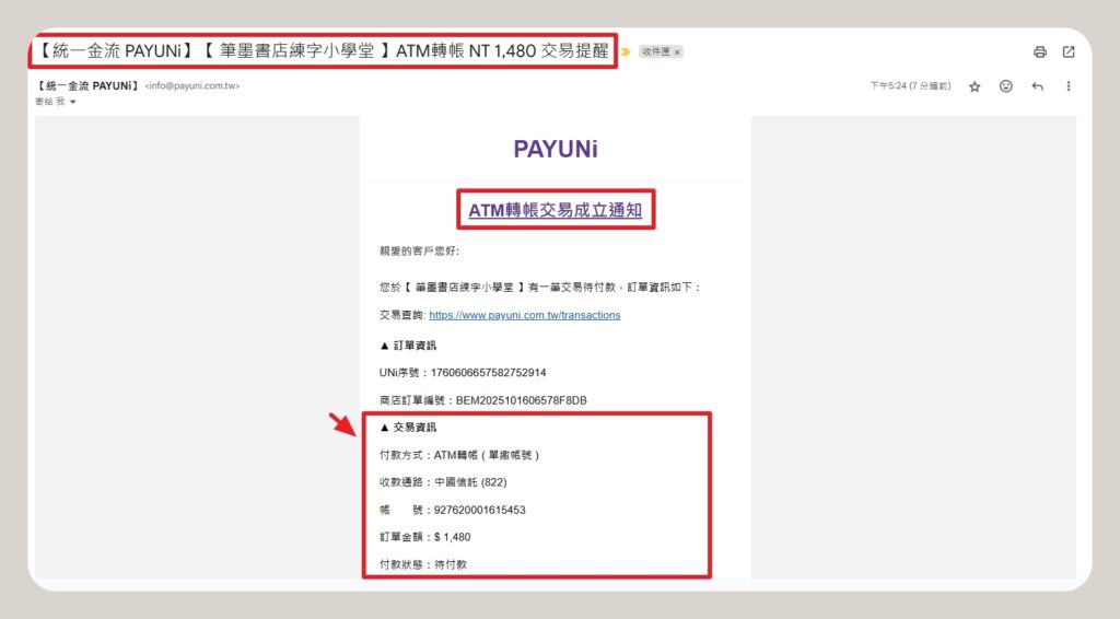 另外系統也會自動發一封 ATM 轉帳的金流通知信,裡面也有詳細的匯款資訊。