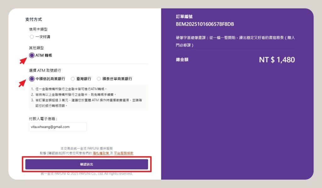 完成後頁面的 Email 欄位會自動帶入你綁定的帳號,最後確認右上方的金額沒問題後,請按下方的「確認送出」按鈕。