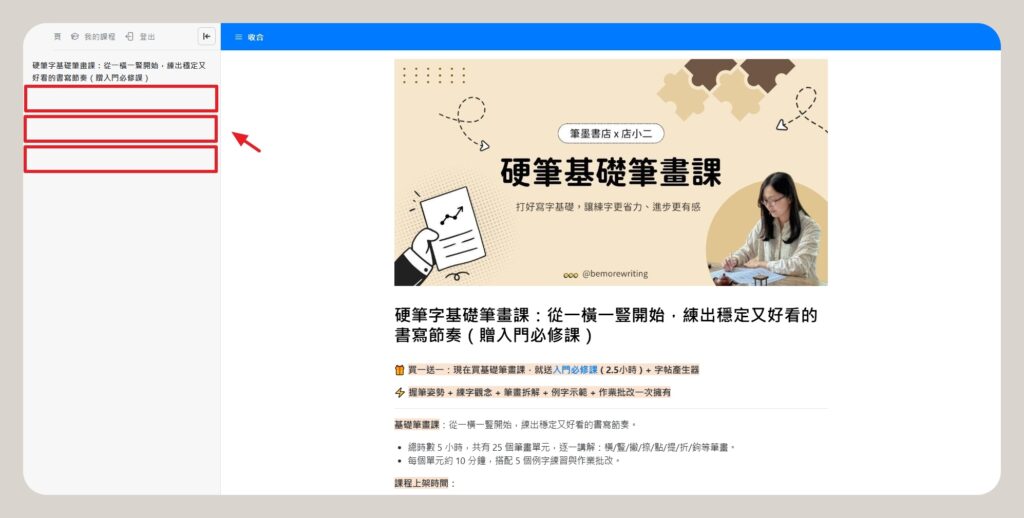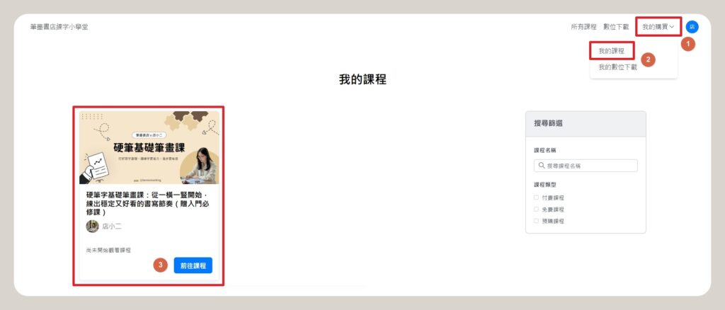 於右上方點選「我的購買 / 我的課程」,若有購買成功即可看到「硬筆字基礎筆畫課」,請點「前往課程」按鈕。