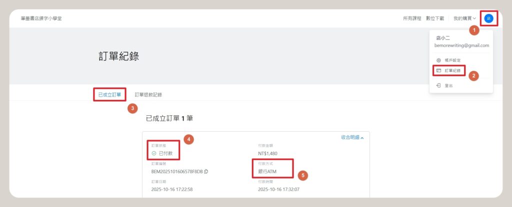 完成匯款後,可以到你的訂單查詢訂單狀態,訂單狀態的欄位顯示已付款,表示報名成功!