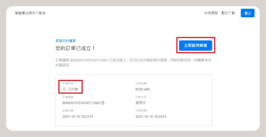 如果你購課時是使用非會員的方式購買(也就是沒有綁定 Google 或 LINE 帳號),在購買成功的頁面,右上角會有一個「立即啟用帳號」按鈕。