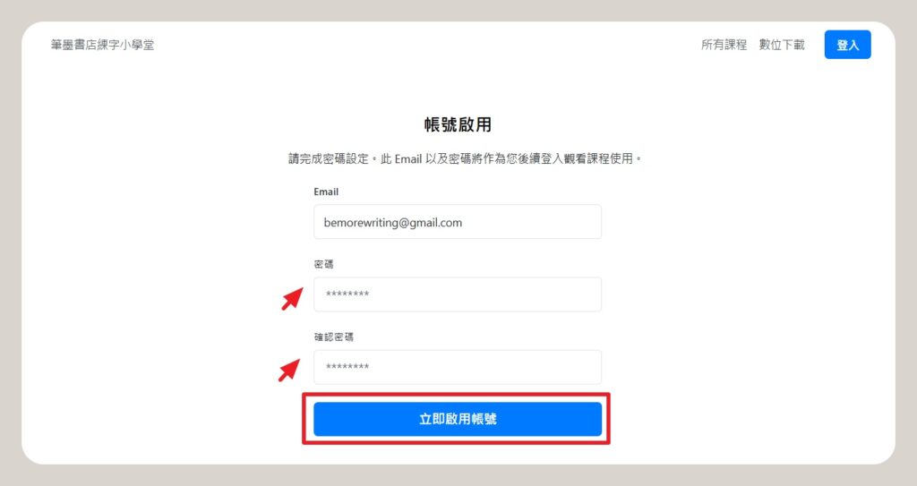 輸入想要使用密碼,點選「立即啟用帳號」就完成密碼的設定囉。如果你是透過綁定 Google 或 LINE 帳號登入課程平台的學員,請忽略這個動作唷~