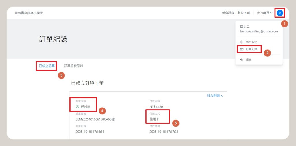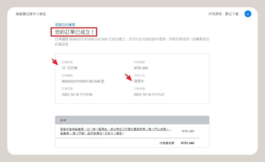 接著畫面會自動顯示訂單畫面,可查看訂單狀態、付款方式。訂單狀態為已付款,表示報名成功!