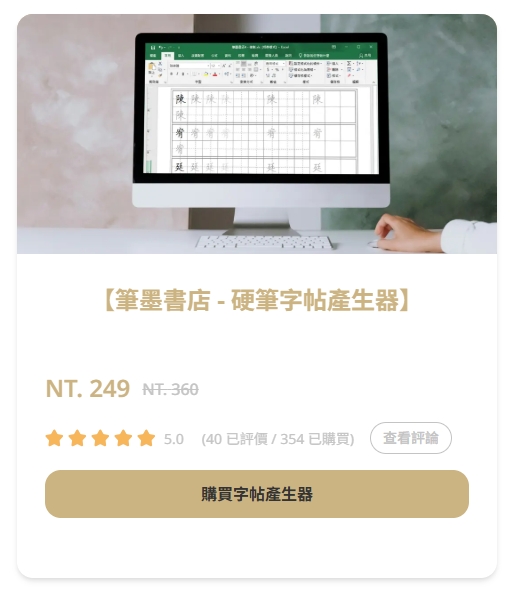 硬筆字帖產生器限時特價 249 元,現在填寫問卷還可以領取 50 元折扣碼!擁有這個小工具,讓你在練習寫字的過程中提高專注度、進步更顯著,快趁握優惠期間買起來👇